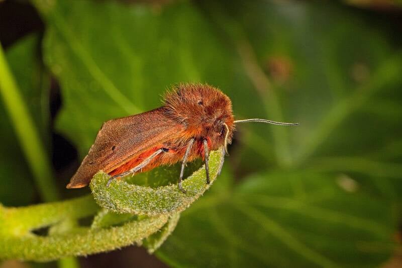 Dit zijn twee bijzonder mooi nachtvlinders. De wilgenhermelijnvlinder heeft mooie witte haartjes en een tekening met oranje accenten. De kleine beer is bruin-rood en in het bijzonder het lijf is vuurrood. Na het vlinderen heb ik hem in de klimop gezet en dat leverde deze foto op. Door hem van opzij en een beetje van onderen te fotograferen kun je het rode lijf mooi zien.