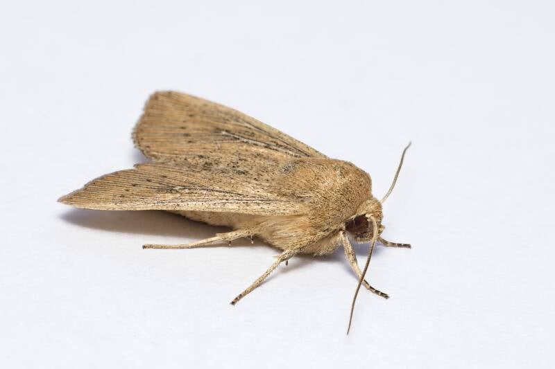 Een prachtige gele nachtvlinder die op de LED-emmer was afgekomen maar ernaast of de grond ging zitten. Voor deze foto moest ik wel op de grond gaan liggen om een laag genoeg standpunt te krijgen.