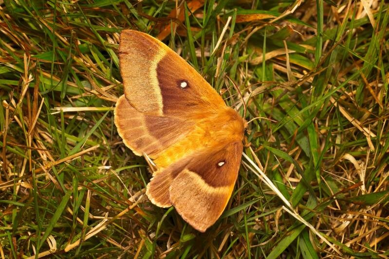 Een grote dagactieve nachtvlinder, maar deze kwam op de lamp en het laken af. Zij landde eerst in het graas en dat gaf de gelegenheid tot deze foto. Je kunt aan de voelsprieten zien dat het een vrouwtje is. De vrouwtjes vliegen voornamelijk in de schemer.