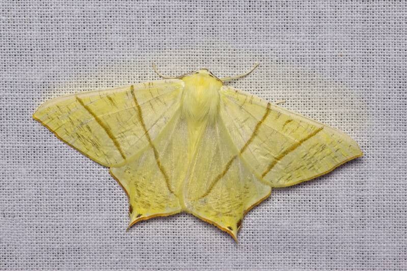 Een prachtige grote, gelige nachtvlinder, met een bijzondere vorm. In het bijzonder de twee punten aan de onderkant, elk met twee donkere stipjes zijn mooi. Een foto recht van boven laat de vorm het beste uitkomen.