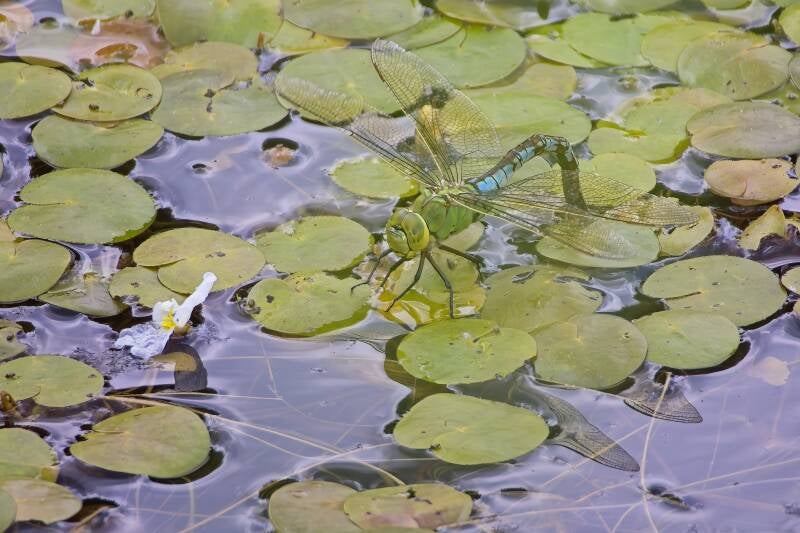 Een prachtige grote libelle die bijna constant rondvliegt. Gelukkig ging hij op een gegeven moment op een stengel aan de overkant van het water zitten. Zo kon ik met mijn telelens deze foto maken zonder dat er stengels in de weg zaten. Hieronder zie je een vrouwtje dat eitjes aan het leggen is in het water.