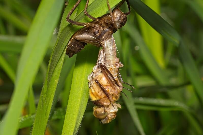 Dit is een libel die je al vroeg in het jaar in grote aantallen ziet. Dit exemplaar ik helemaal op kleur. Ze blijven maar weinig stilzitten. Hieronder een foto van een smaragdlibel die aan het uitsluipen is en langzaam uit de huid van de larve kruipt.