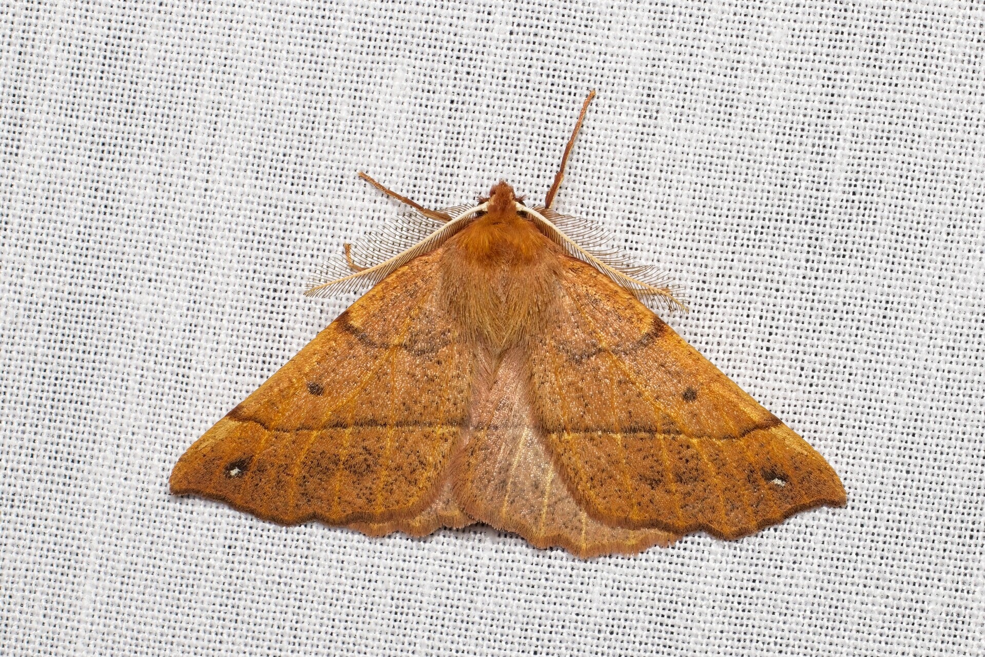 Ik had al wel eerder de rups van deze nachtvlinder gezien maar niet de vlinder zelf. Maar nu kwam deze op mijn laken zitten. En zij legde daar ook eitjes (zie hieronder). Ik zal die op een braam in de buurt zetten want dat is een van de waardplanten.