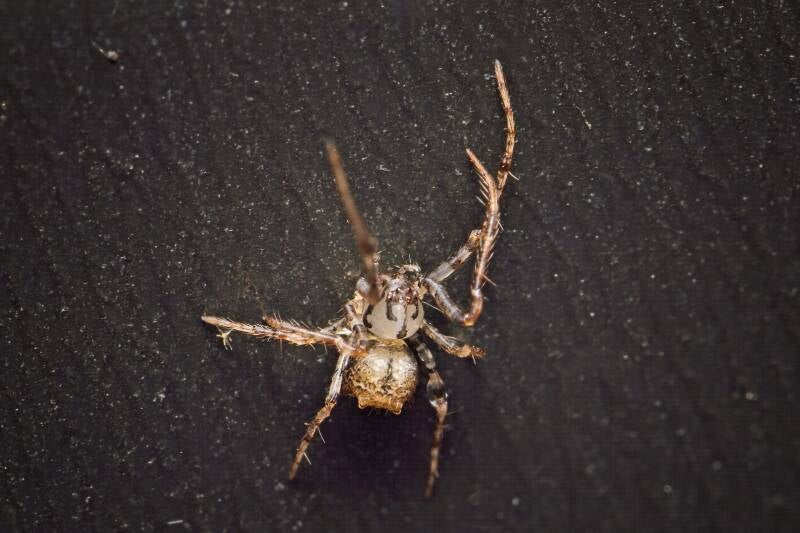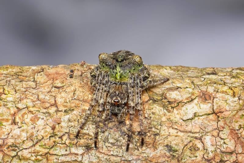 Je ziet haast niet dat dit een spin is als hij stil op een boomstam zit. De poten zijn vrijwel onzichtbaar. Op deze foto kun je ook mooi de vele ogen van de spin zien.
