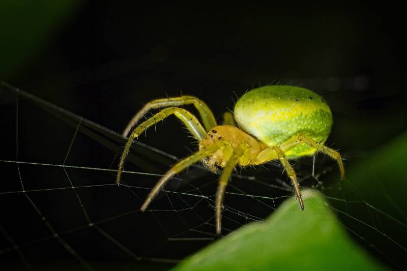 Een van de verschillende soorten komkommerspinnen. Kleine groene spinnetjes. Deze foto geeft een mooi contrast met de donkere achtergrond. Wel is het spinnenweb wat rommelig, maar dat hoort er natuurlijk ook wel bij.