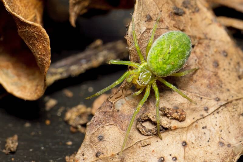 Dit kleine groene spinnetje zie ik regelmatig in mijn tuin. Meestal zit hij op groene bladeren en dat geeft geen mooie foto. Op deze dode bruine bladeren krijg je een veel beter contrast.