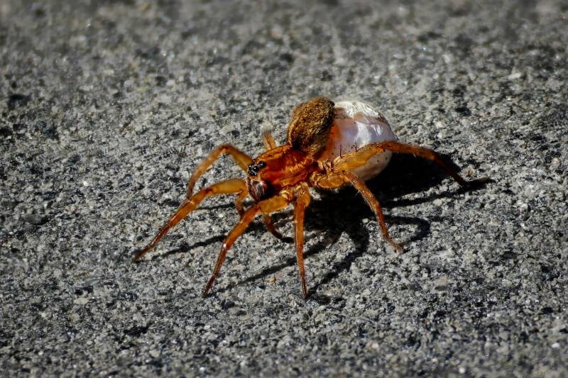 Deze wolfspin draagt een grote eierzak mee. Om deze goed scherp te fotograferen heb ik focus stacking gebruikt. Je ziet wel een erg harde schaduw van de zon.