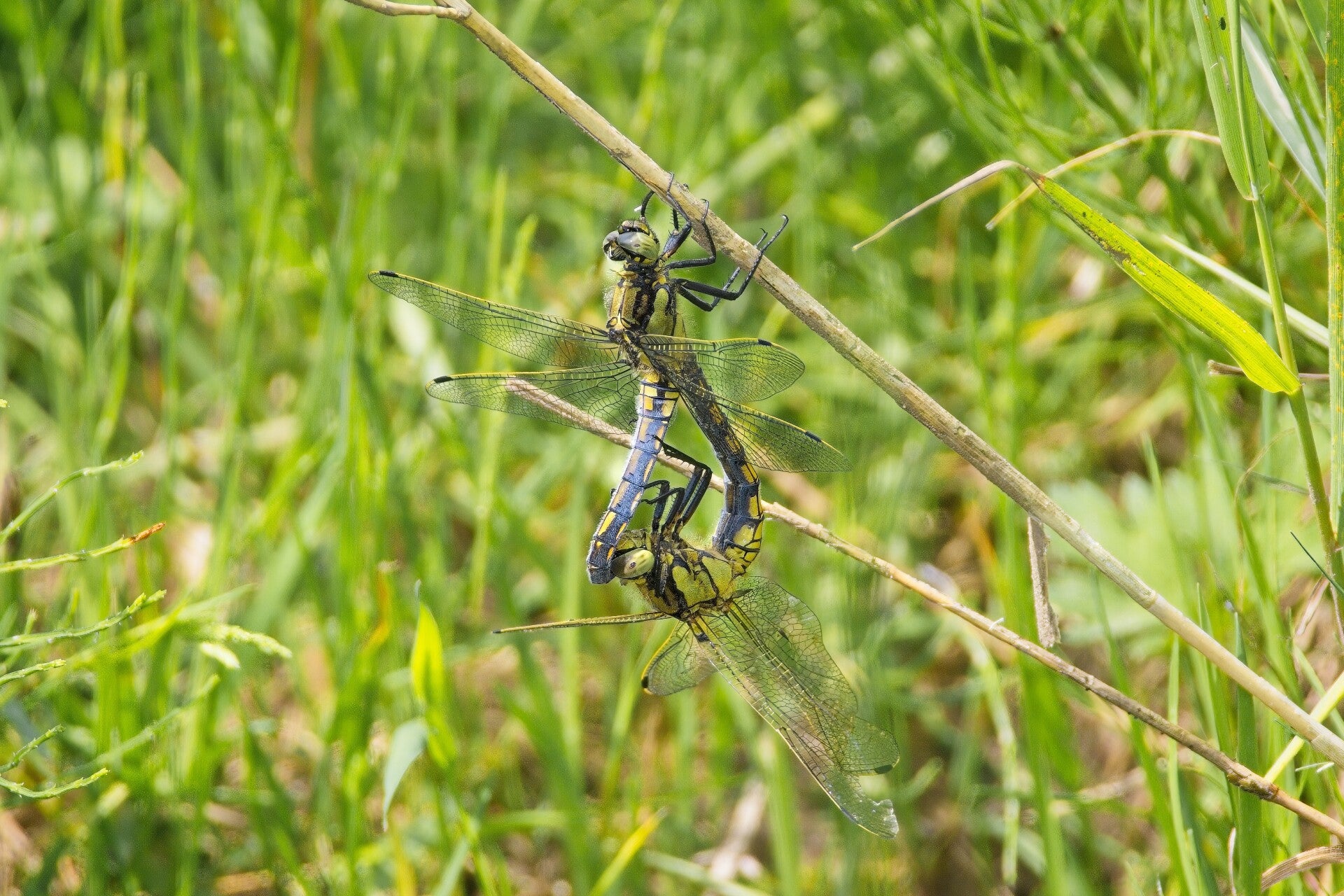 Aan beide zijden lopen runderen. Die vormen geen enkel gevaar maar ze hebben de bodem wel erg stukgetrapt. Er zijn geen paden dus je moet je een weg banen over zeer hobbelig en soms drassig gebied, met meestal hoog gras. Gelukkig hoef je niet ver te lopen. Ik ging hier vooral heen voor de libellen en die zijn er vanaf het moment dat je de gebieden in loopt. Zo zag ik er deze parende gewone oeverlibellen en de prachtige weidebeekjuffer.